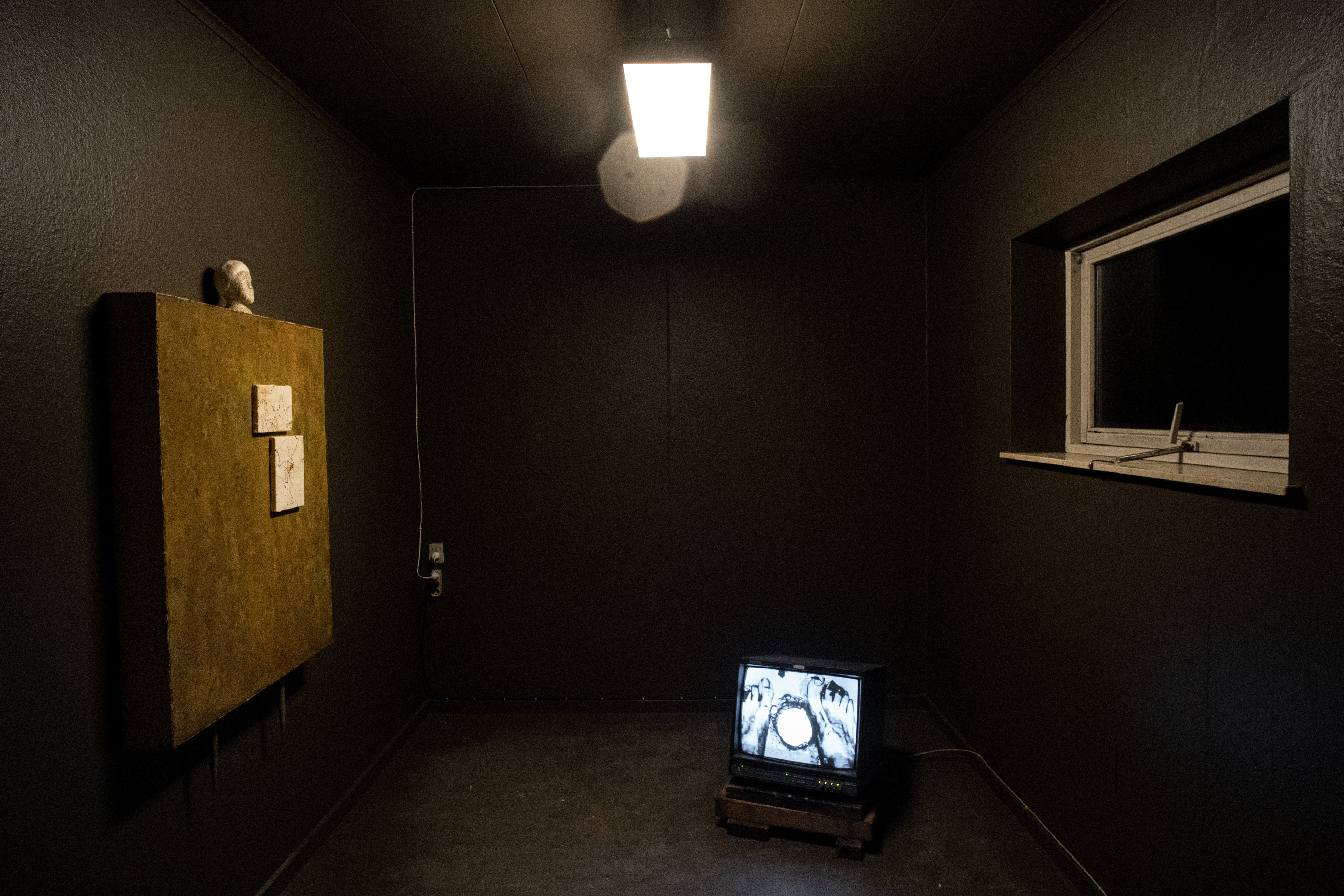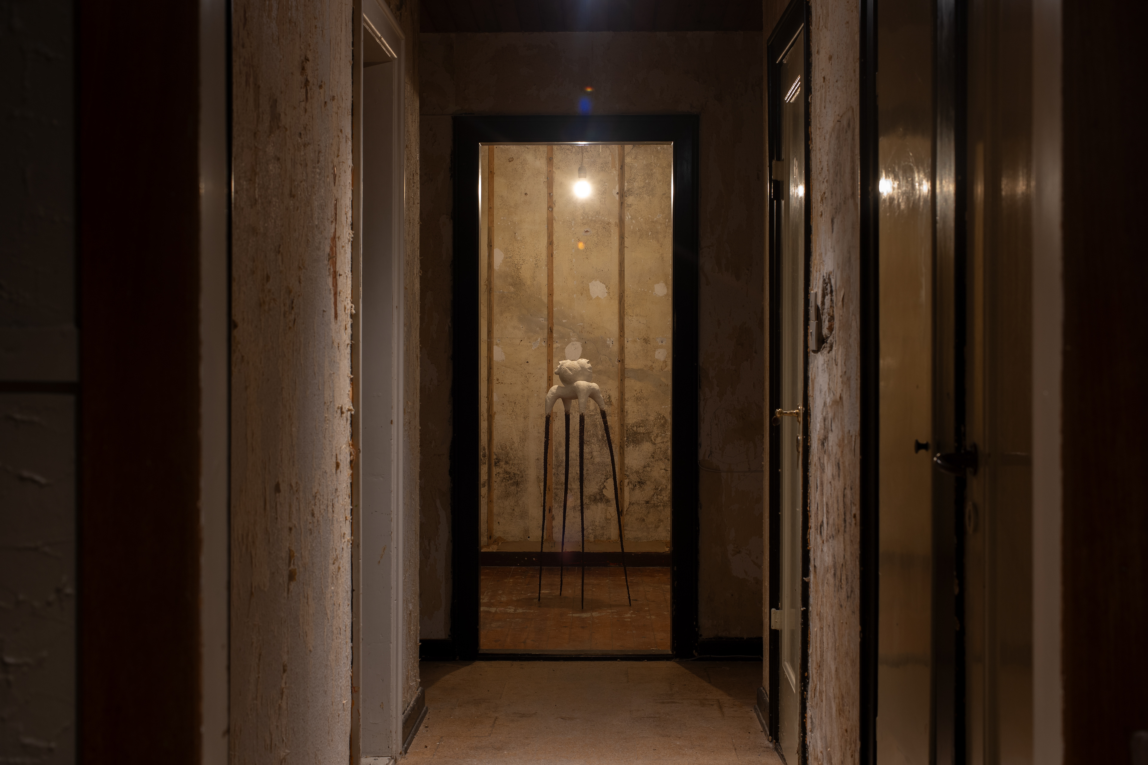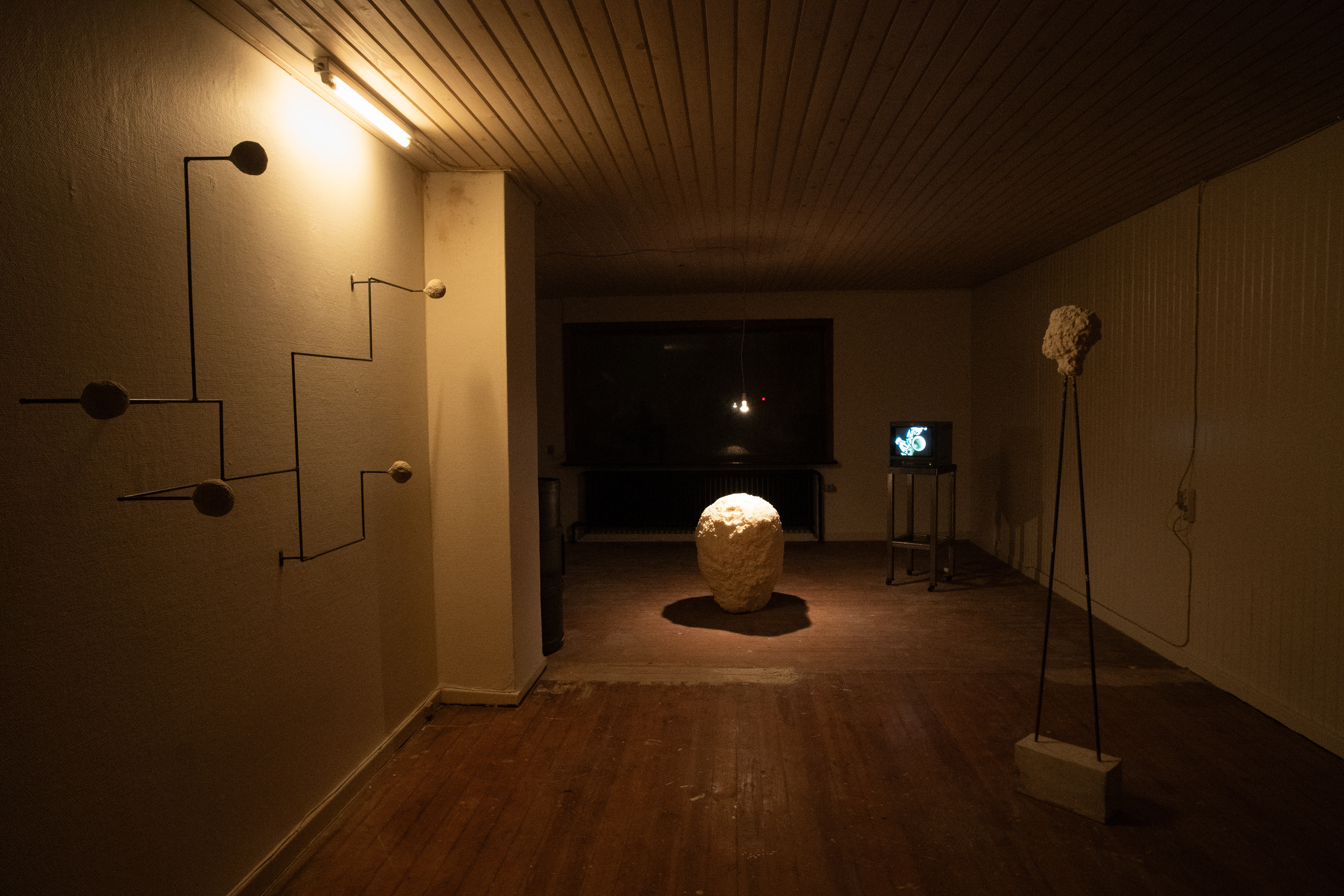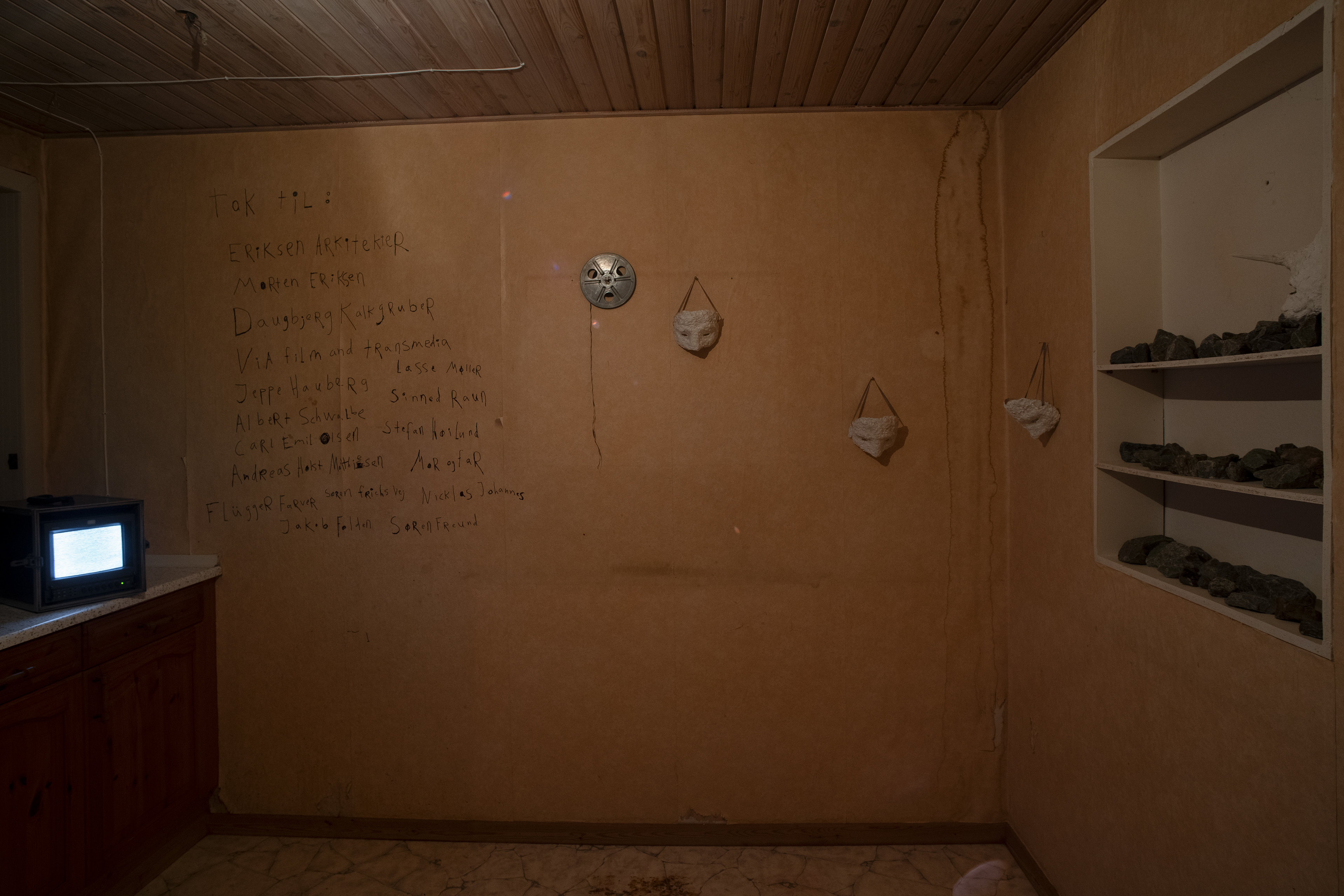 too dark for jazz is a video and sculpture installation that unfolds in an old, crumbling house from the 1950s, which is scheduled for demolition after the exhibition. Since the summer of 2025, I have been working with the house to make the exhibition’s three rooms function together within the universe I wish to present to the audience. The exhibition presents new sculptures in dialogue with home-developed Super 8 film and video works on tape.